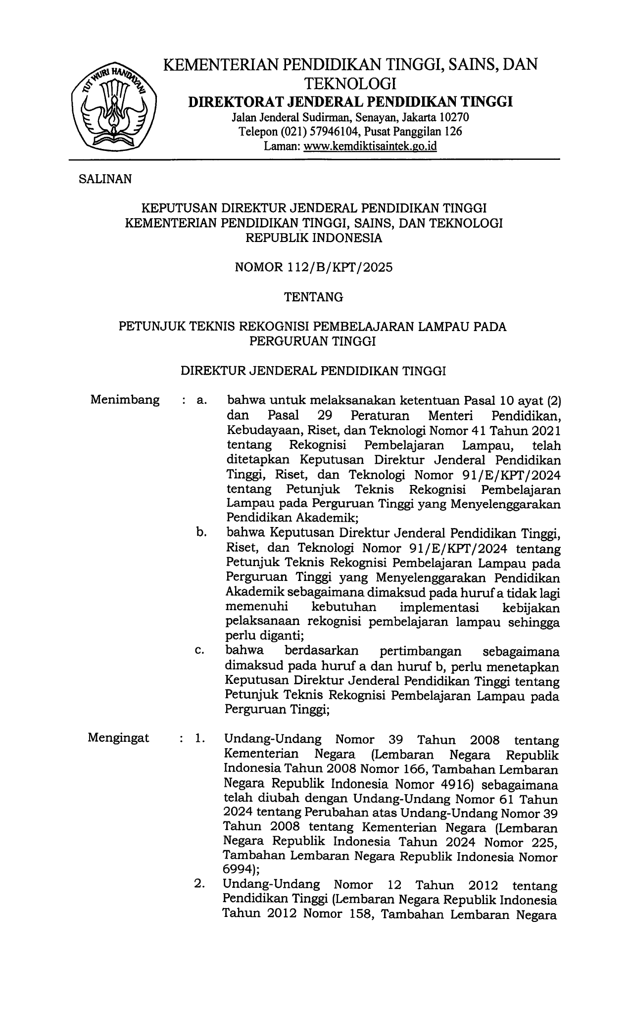 Berisi Keputusan Dirjen, Petujuk Teknis dan Pedoman Pelaksanaan Rekognisi Pembelajaran Lampau (RPL)